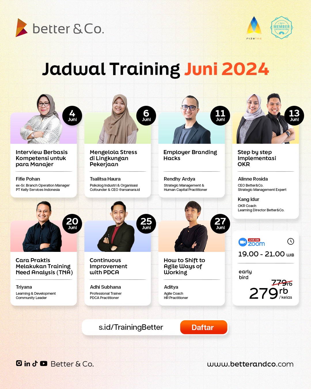Better & Co. dengan bangga mengumumkan jadwal training untuk bulan Juni 2024. Berbagai sesi pelatihan ini dirancang untuk membantu para profesional meningkatkan keterampilan dan pengetahuan mereka dalam berbagai bidang. Pelatihan ini mencakup topik-topik penting yang relevan dengan kebutuhan dunia kerja saat ini, mulai dari manajemen stres, branding perusahaan, hingga implementasi OKR. Berikut adalah rincian lengkap setiap sesi pelatihan, termasuk profil para coach dan trainer yang akan memandu Anda.